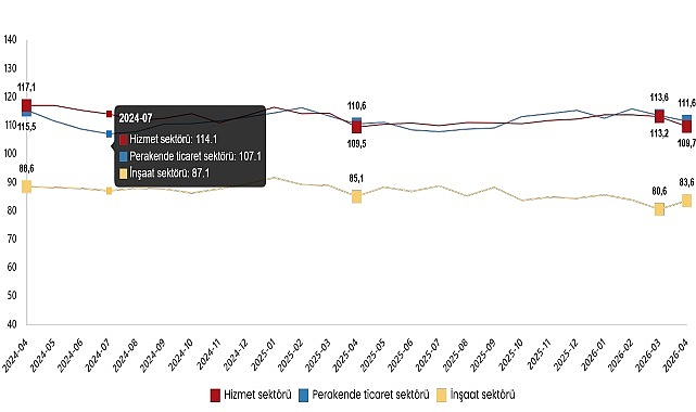 Güven endeksi hizmet sektöründe %3,1 azaldı, perakende ticaret sektöründe %1,8 azaldı, inşaat sektöründe %3,6 arttı